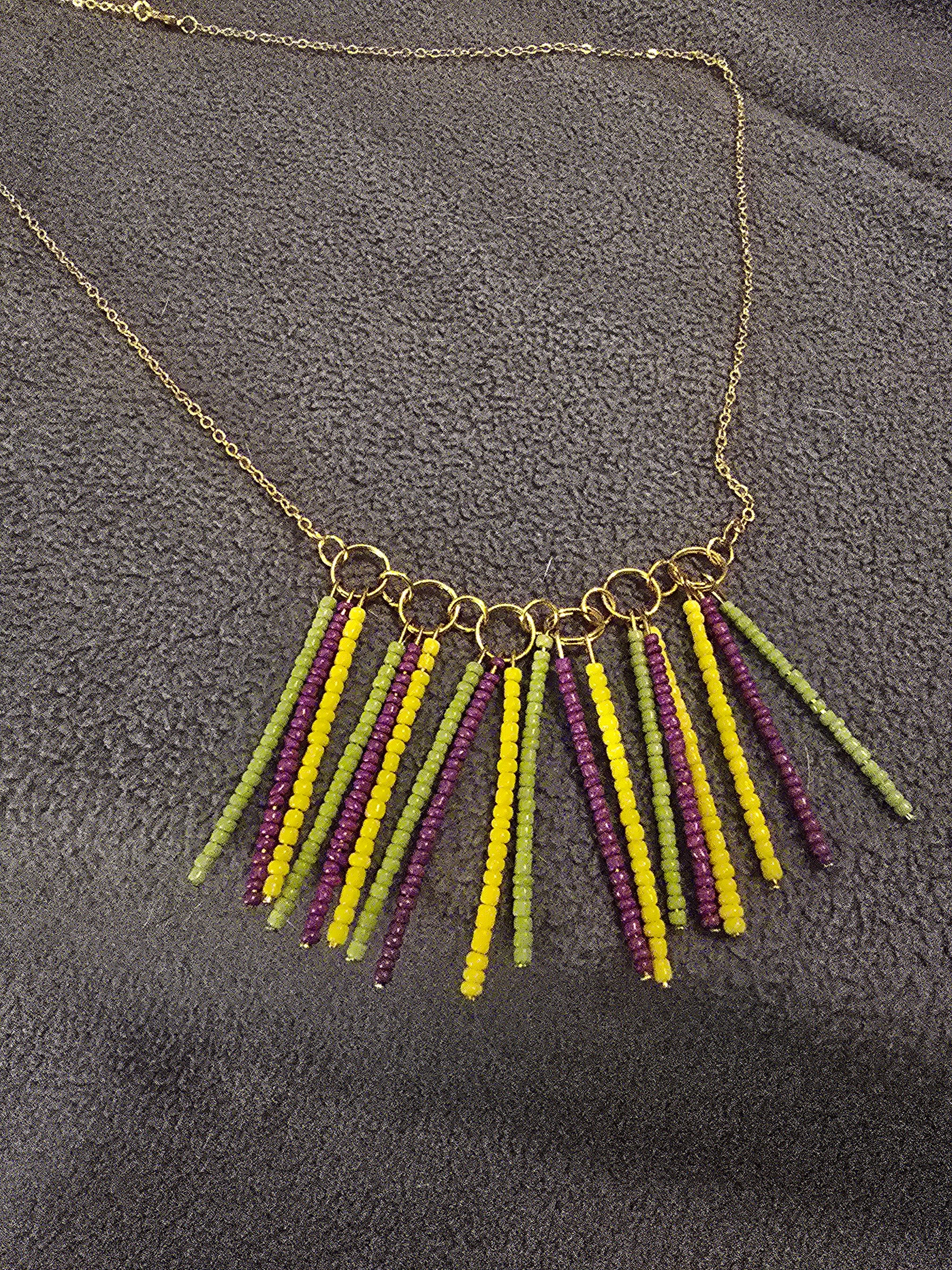 This colorful necklace boasts a playful combination of purple, green, and yellow seed beads complemented by a delicate gold chain. Perfect for adding a pop of color to any outfit, it's the ideal accessory for those who like to stand out in a fun and unique way!