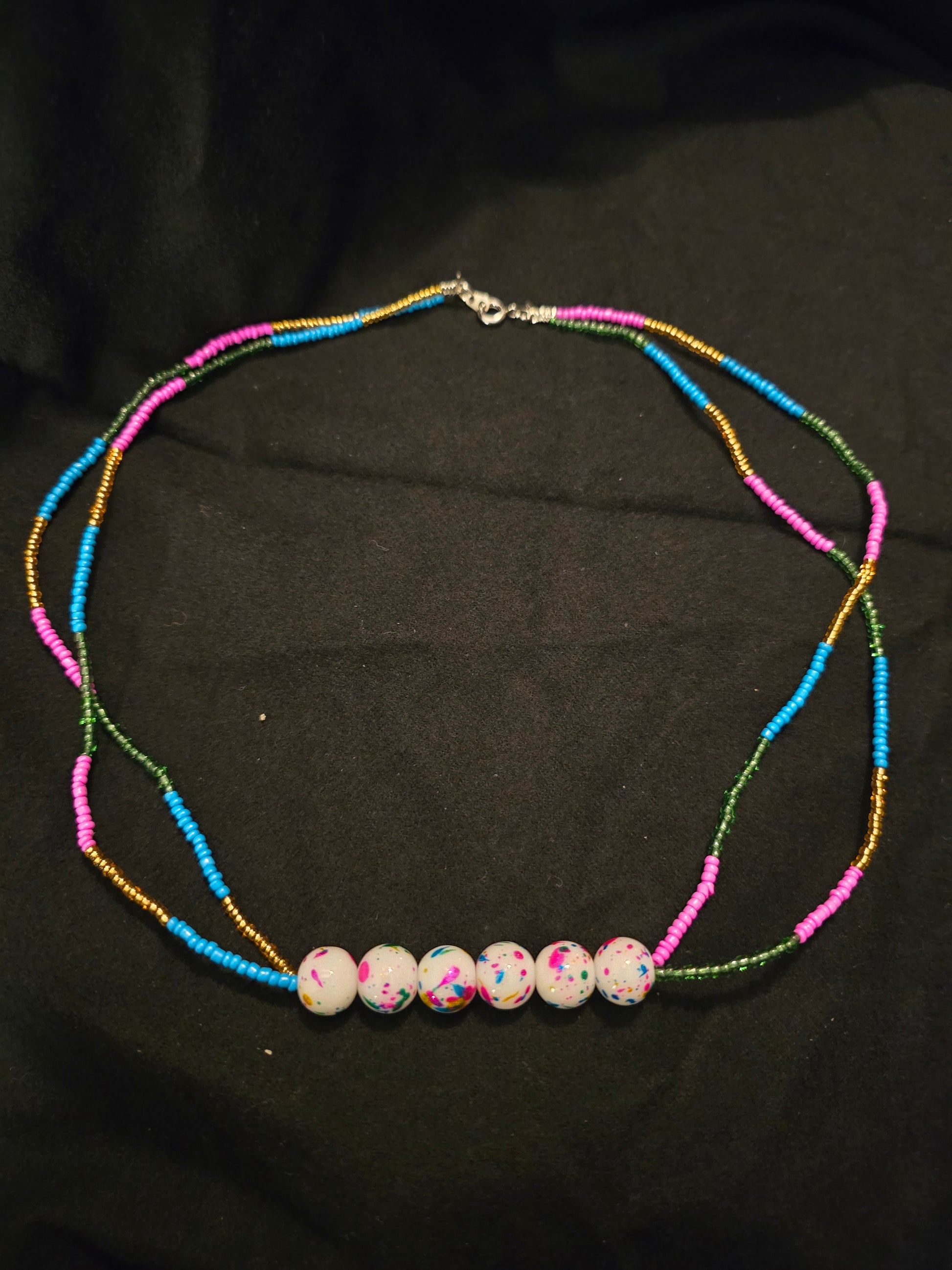 Elevate your style with Color Splatter, a handcrafted necklace featuring vibrant splatter beads on a seed bead cord. Express your unique self with this colorful statement piece. Each necklace is unique, just like you!