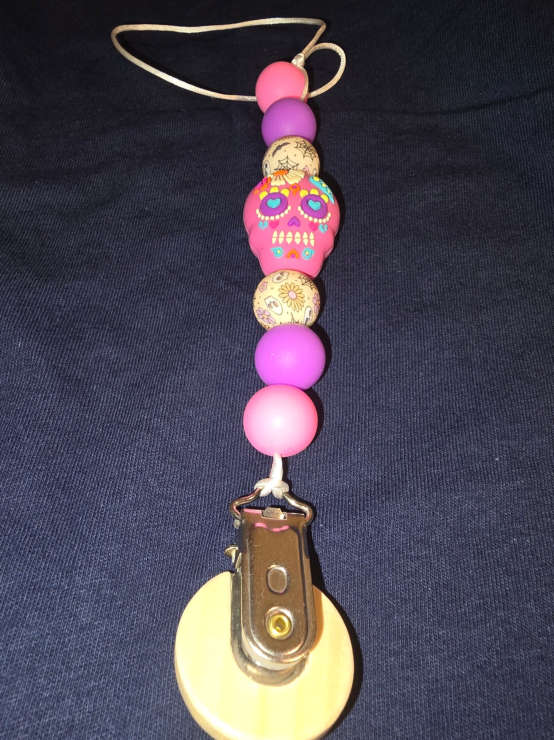Say goodbye to lost pacifiers with our Sugar Skull Pacifier Clip! Made with silicone beads and featuring a unique sugar skull design, this clip is both functional and stylish. Keep your little one's pacifier within reach while adding a playful touch to their outfit.