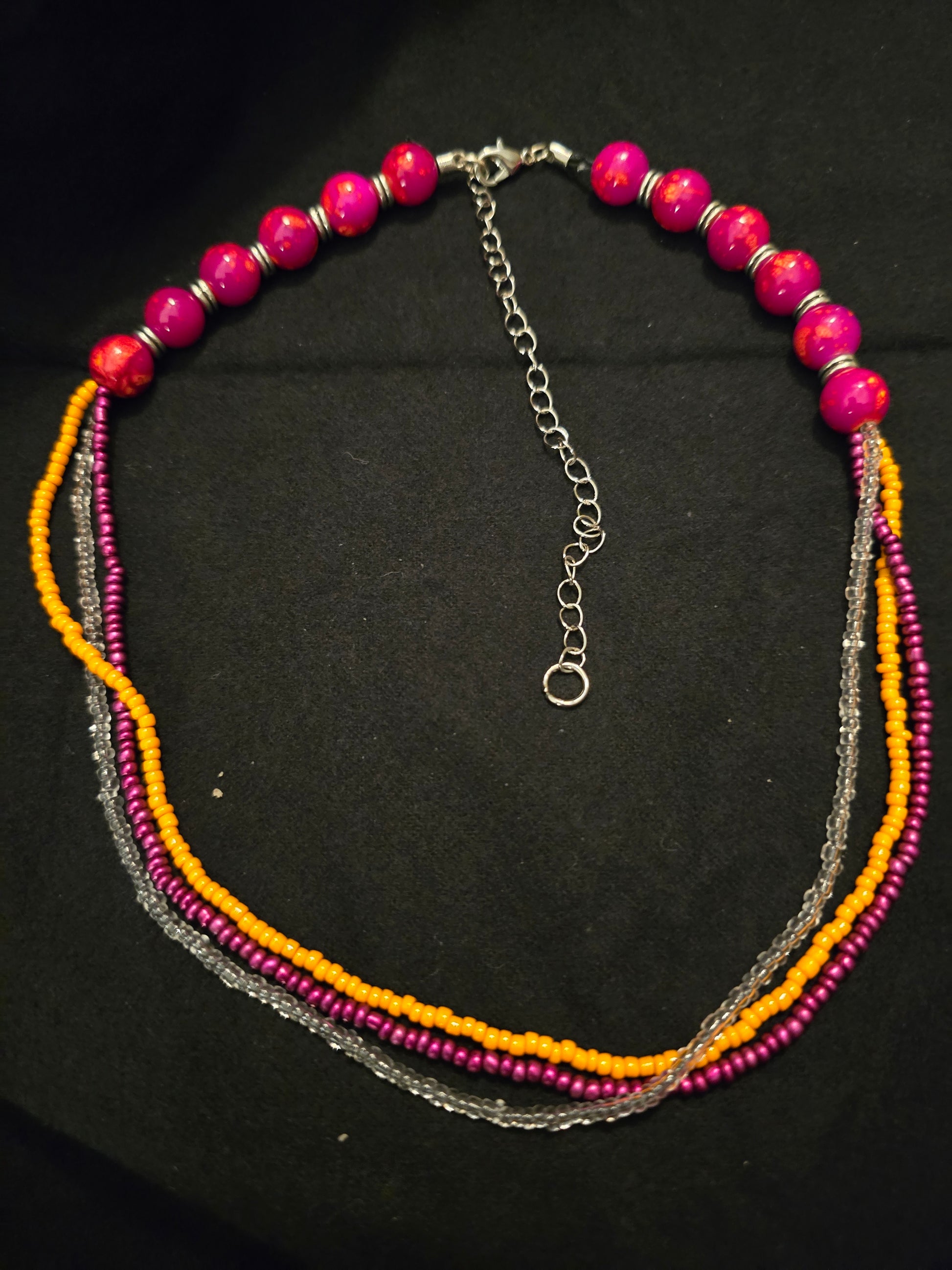 Hand-crafted with vibrant pink and orange seed beads, this stunning piece is sure to make a statement. Elevate any outfit and showcase your unique style with this eye-catching accessory.