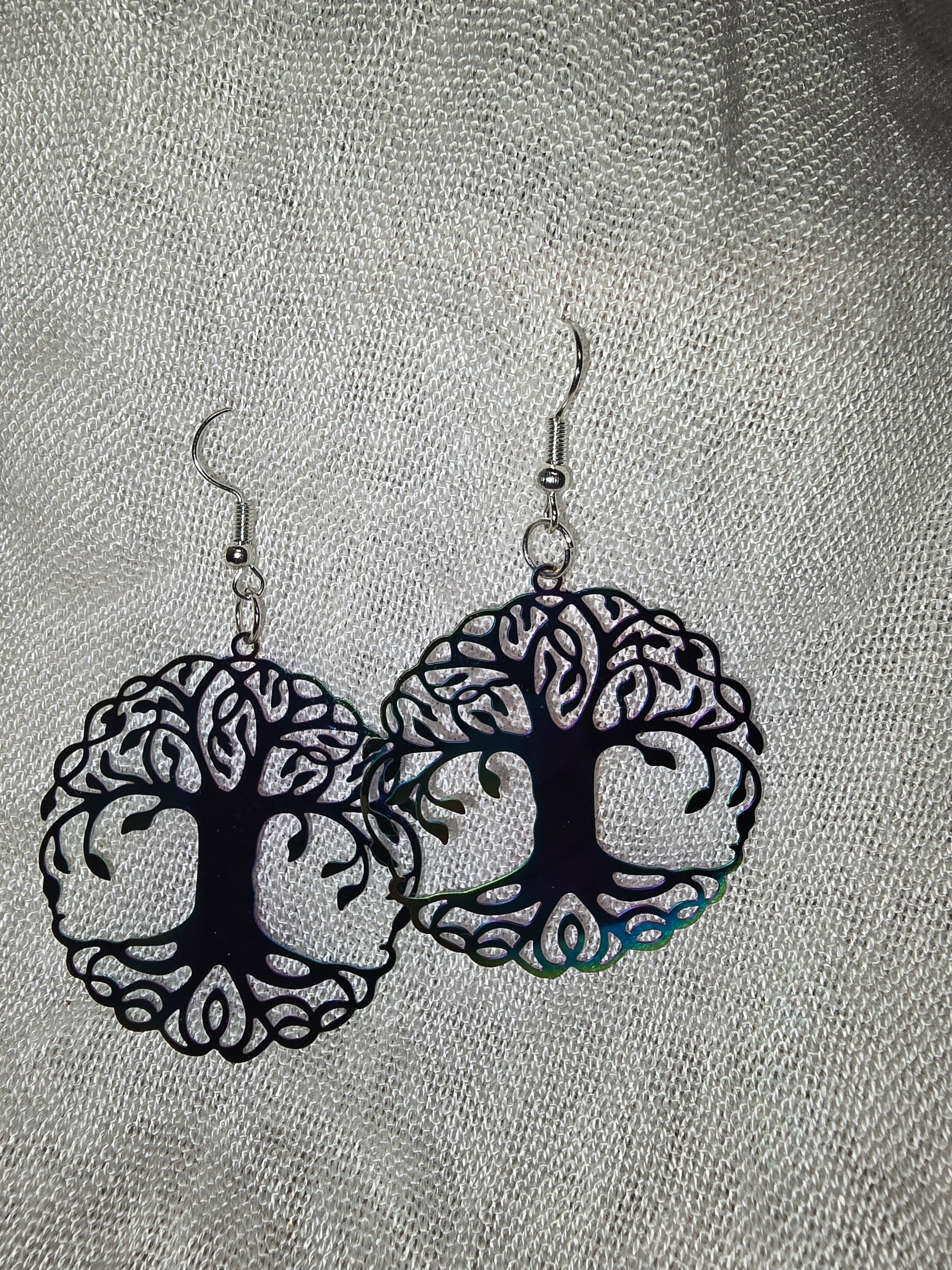 "Add some whimsy to your look with our Tree of Life earrings! These colorful earrings feature a rainbow metal design that's sure to catch the eye. Embrace your inner nature lover and show off your playful side with this unique and stylish accessory.