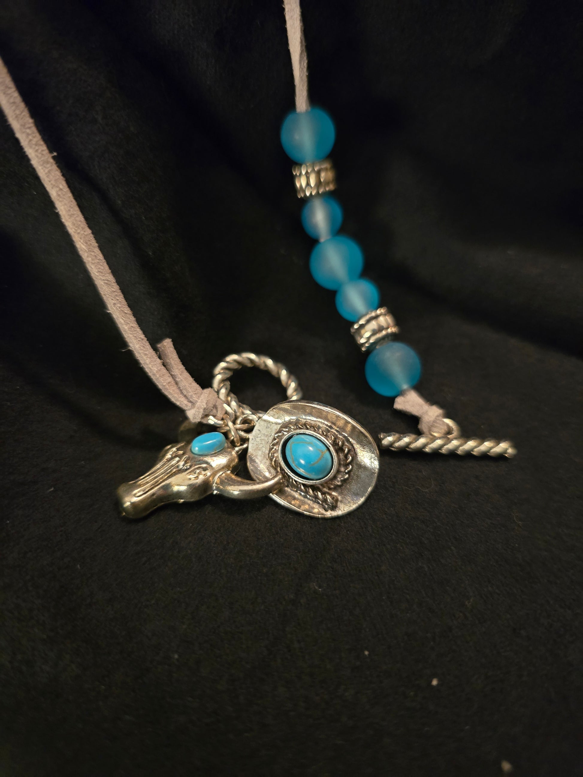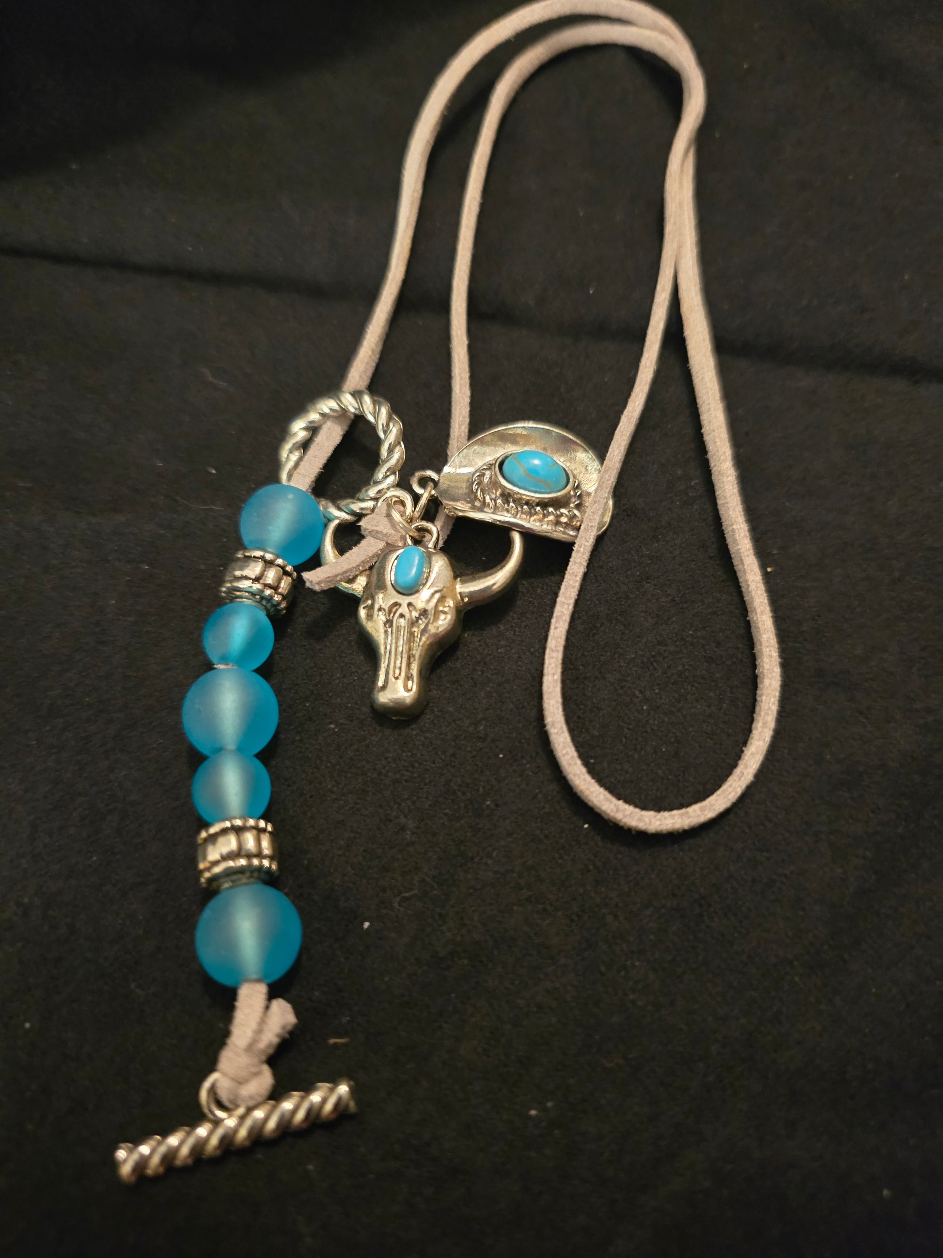 Unleash your wild side with our Turquoise Longhorn necklace. Handcrafted with a gorgeous suede cord and adorned with silver charms, this piece adds a touch of rustic elegance to any outfit. Perfect for the free-spirited soul who loves unique accessories!