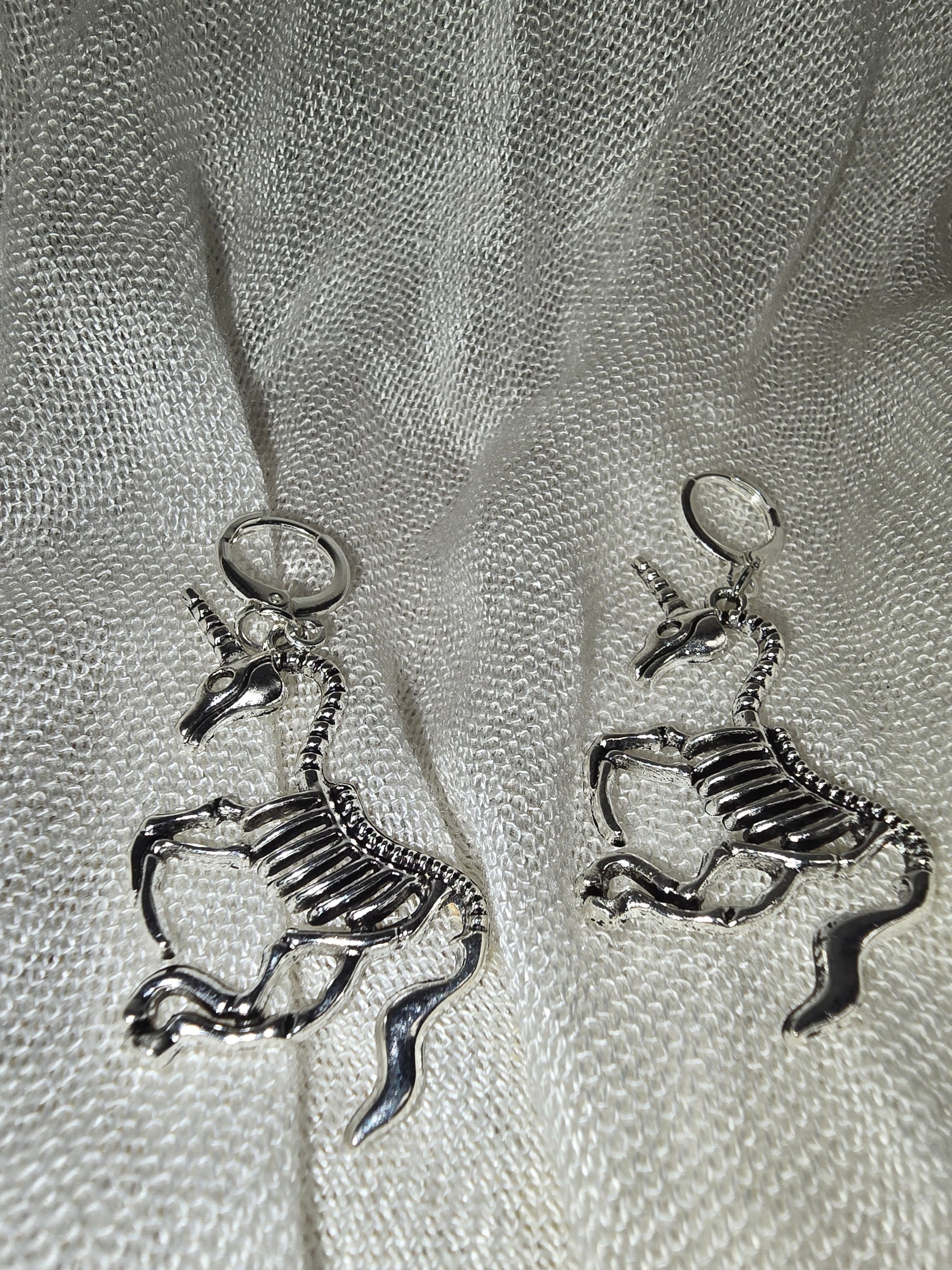 Add a touch of whimsy to your wardrobe with these unique Unicorn Skeleton Earrings. Perfect for the spooky season, these earrings are sure to make a statement. Showcase your playful side with these quirky and fun earrings. (No unicorns were harmed in the making of these earrings!)